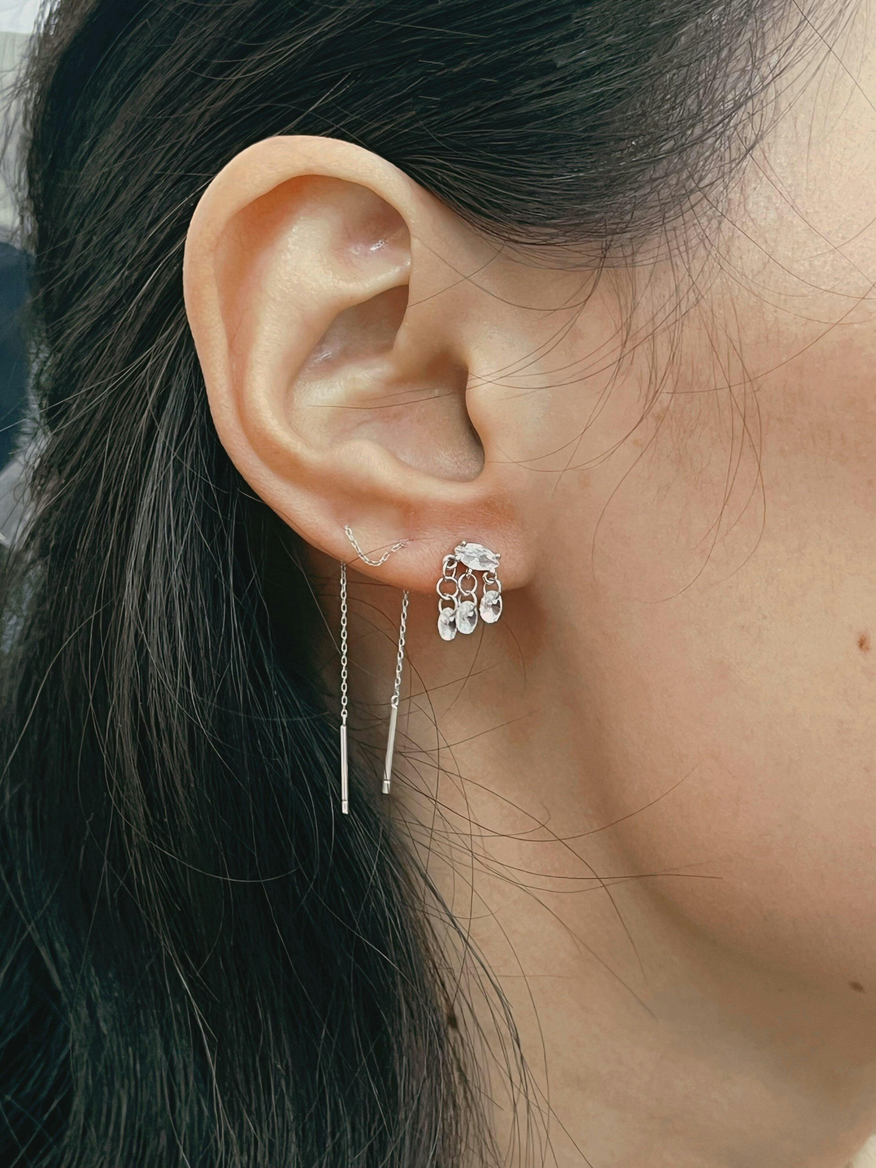 Experience a cascade of brilliant sparkle with our dynamic CZ tassel chain earring. This elegant 16G flatback features a dazzling chain of premium AAAAA Zirconia stones, bringing mesmerizing movement and modern glamour to your curated ear collection. Perfect for making a statement while maintaining everyday comfort.